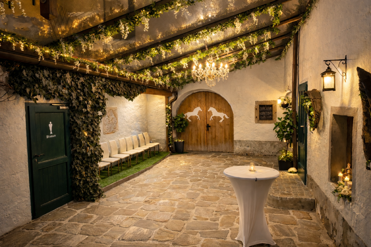 Hier findet die Zusammenkunft der Gäste bei Schlechtwetter und vor dem Einzug in die Kirche statt. Weiters bietet der Innenhof die perfekten Voraussetzungen für ein Fotoshooting bei unbeständigem Wetter. (Wintergarten mit ca.300m²)